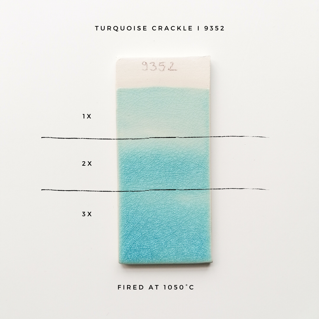 9352 Turquoise Crackle är en blank, semitransparent turkos penselglasyr för lergods som utvecklar dekorativa krackeleringar i ytan. Glasyren ger en levande turkos färg med ett karakteristiskt nätverk av fina sprickor som kan framhävas ytterligare genom infärgning.