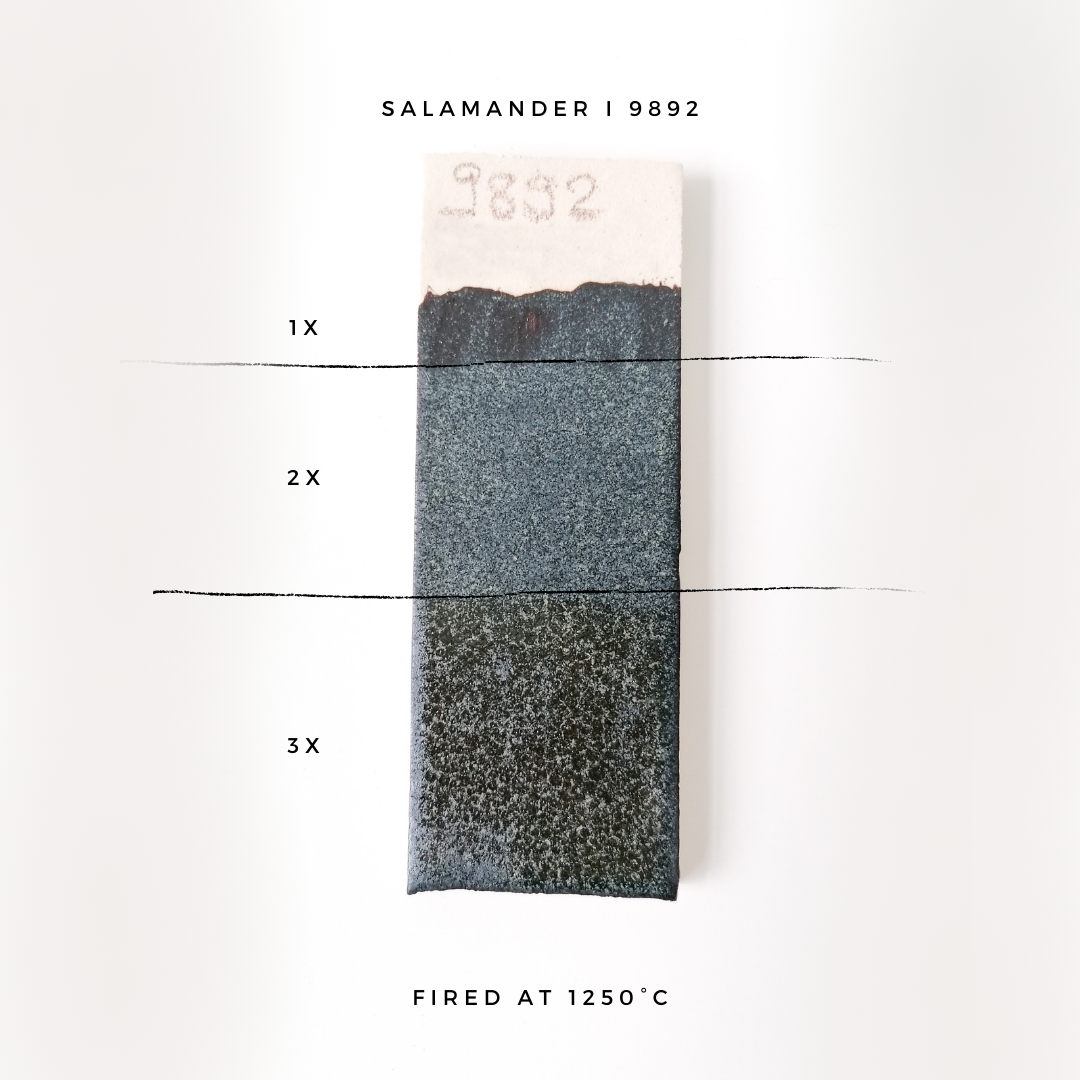 9892 Salamander är en satängglansig svartgrå stengodsglasyr med senapsgula fina prickar som arrangerar sig i fjäll-liknande mönster. Glasyren ger ett naturligt uttryck som varierar vackert beroende på bränningstemperaturen. Den är lätt att arbeta med och lämpar sig både för dekoration och större ytor på stengods.