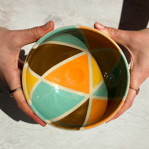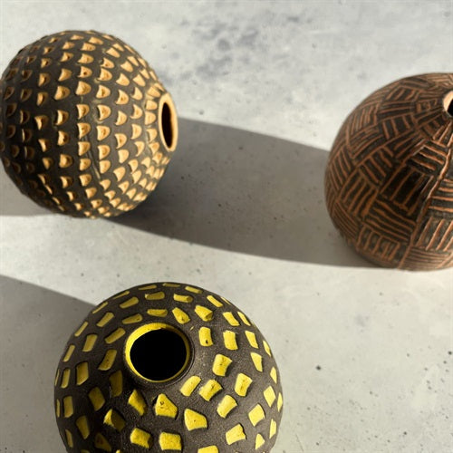 Beläggningen framstår som mjuk matt/jordig utan glasyr. Bra täckning och skarpa konturer.