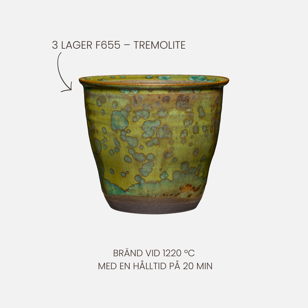 F655 Tremolite är en kristallglasyr för porslin och stengods. Under bränningen bildar glasyren tydliga kristaller som skapar ett levande spel av mörka, transparenta och ljusare nyanser. Ingen bränning blir den andra helt lik – och det är just det som gör kristallglasyr så unik och speciell. Glasyren är lätt att arbeta med och passar både för dekorativa detaljer och full yttäckning.