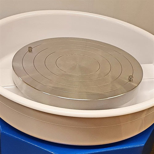 Denna drejskiva har skruvar så att löstagbara drejtallrikar kan monteras på drejskivan.