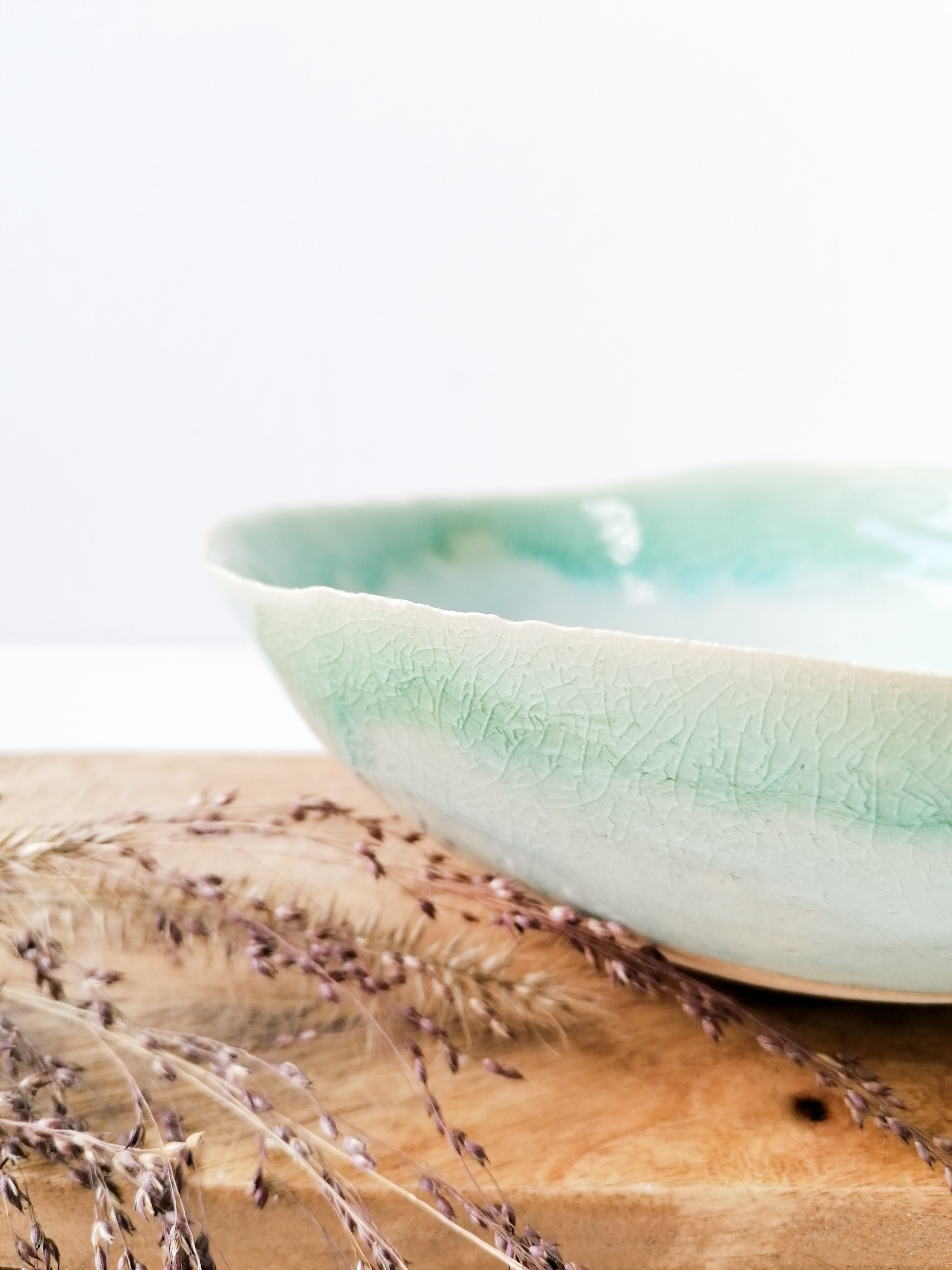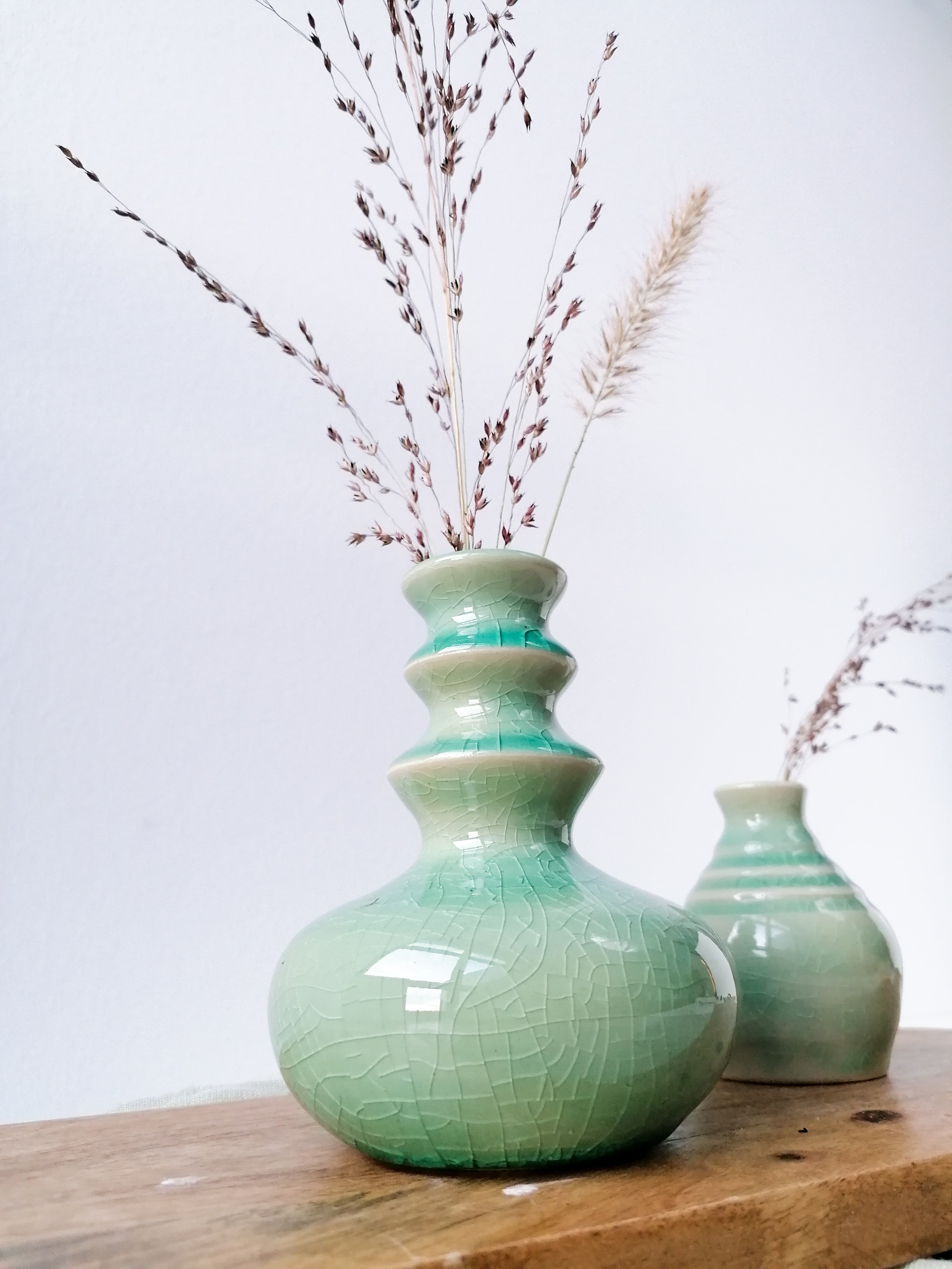 - 1250°C: Helt slät yta med krackeleringar och en fin celadongrön ton.