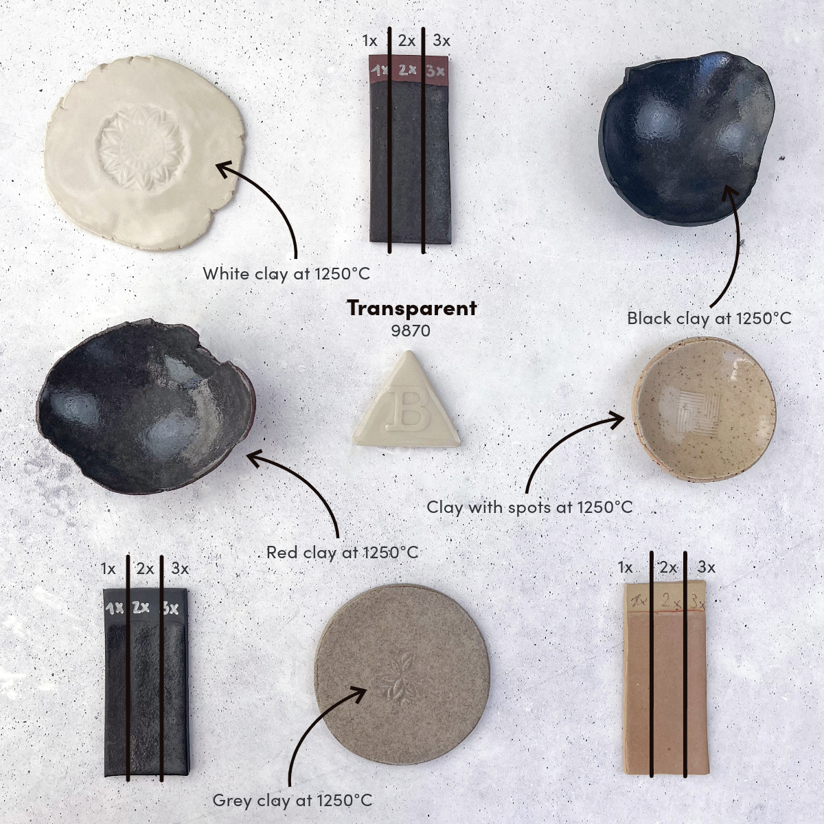 9870 Transparent är en färglös, transparent och glansfull stengodsglasyr. Den är lätt att arbeta med och rinner inte. Bränns den vid 1220°C blir den mer satängglansig.