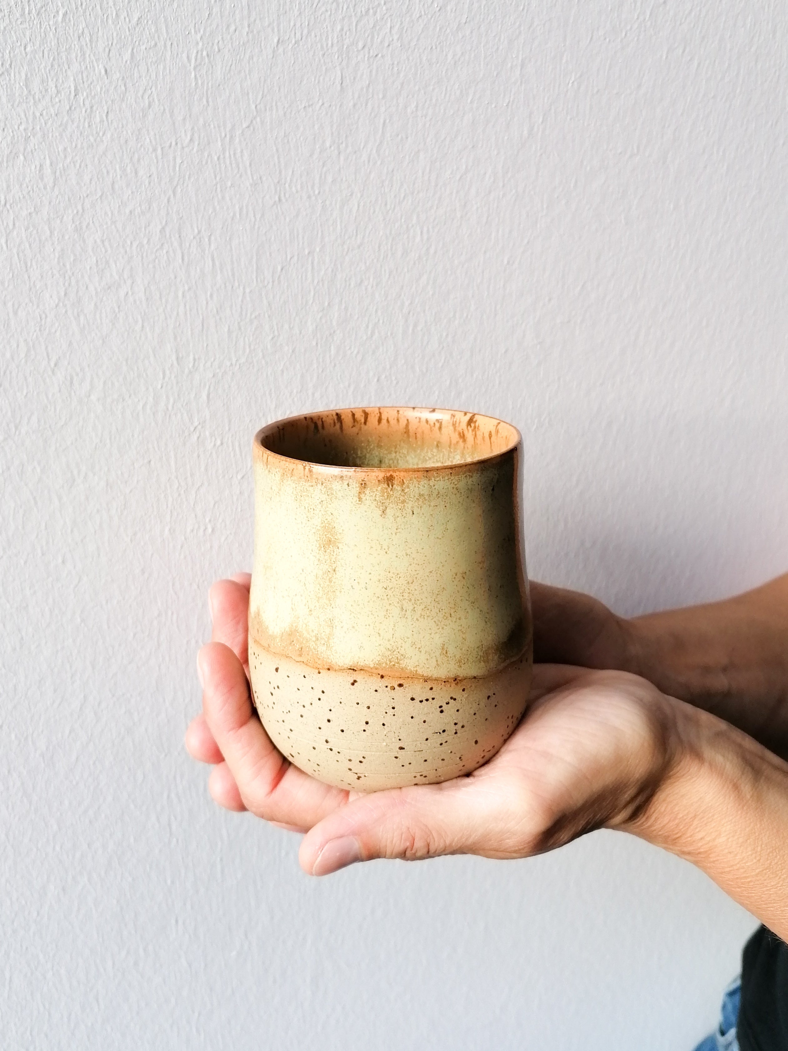 - 1220°C: Silkesmatt, lätt grönaktig ockragul med spel i färgerna.
