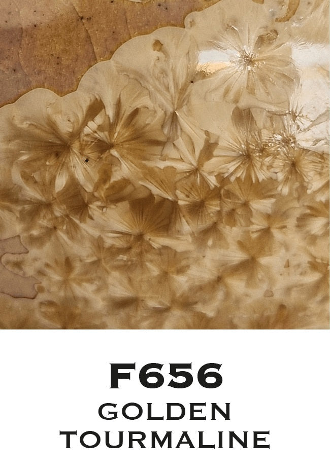 F656 Golden Tourmaline er en krystalglasur til porcelæn og stentøj. Under brændingen danner glasuren tydelige krystaller, som giver et levende spil af mørke, transparente og lysere nuancer. Ingen to brændinger bliver helt ens – og det er netop dét, der gør krystalglasur så unik og særlig. Glasuren er nem at arbejde med og egner sig både til dekorative detaljer og fuld overfladedækning.